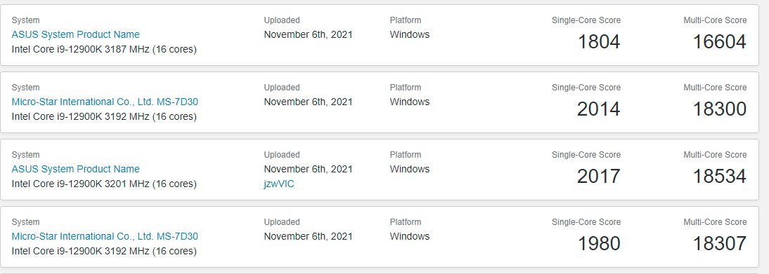 حالا اولین نتایج بنچمارک گیک‌بنچ ۵ پردازنده پرچمدار اینتل Core i9-12900K منتشر شده که از عملکرد بسیار بالاتر آن در بخش چند هسته‌ای نسبت به M1 پرو و M1 مکس خبر می‌دهد. این پردازنده اینتل تقریبا ۱.۵ برابر سریعتر از تراشه‌های اپل است. اینتل Core i9-12900K در بخش چند هسته‌ای بطور میانگین امتیاز ۱۸,۵۰۰ را کسب کرده، در حالی که امتیاز چیپ‌های اپل نزدیک به ۱۲,۵۰۰ است.